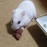 エサの用意が出来て、さっそくハム用チーズを食べるコーキです。