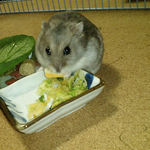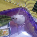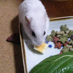 ケージに帰って、ようやく落ち着いたのか、エサ皿の小松菜を食べだしたマシロです。