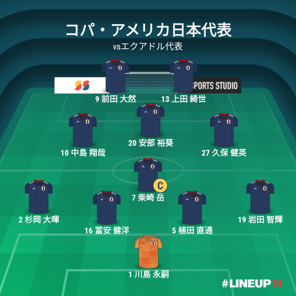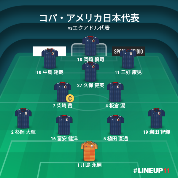 日本の先発は、GKに川島、CBに植田と冨安、右SBに岩田、左SBに杉岡、ボランチに柴崎と板倉、右SHに三好、左SHに中島、トップ下に久保、トップに岡崎という布陣でした。久保がトップ下で先発復帰です。