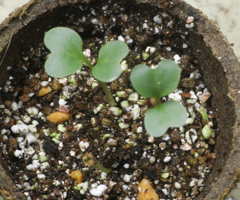 キュウリと同じタイミングで種を植えて苗をつくっていた、スティックセニョールと言う茎ブロッコリーだが、育ちが悪い上にアオムシに食われて葉がほとんどなくなっちゃたんで、あらためて種から作りなおす事にした。もう、種植えのシーズンは終わっちゃってるけど。それが、芽を出してます。