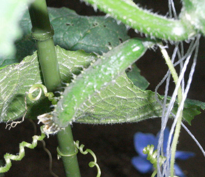 もう一株のキュウリは元気に生長している。葉の大きさが全然違うので一目瞭然。だが、こちらの株はなぜか雌花がすくなく、未だにキュウリに成りそうなのがあまりない。雄花はたくさん咲いてるのだが...。