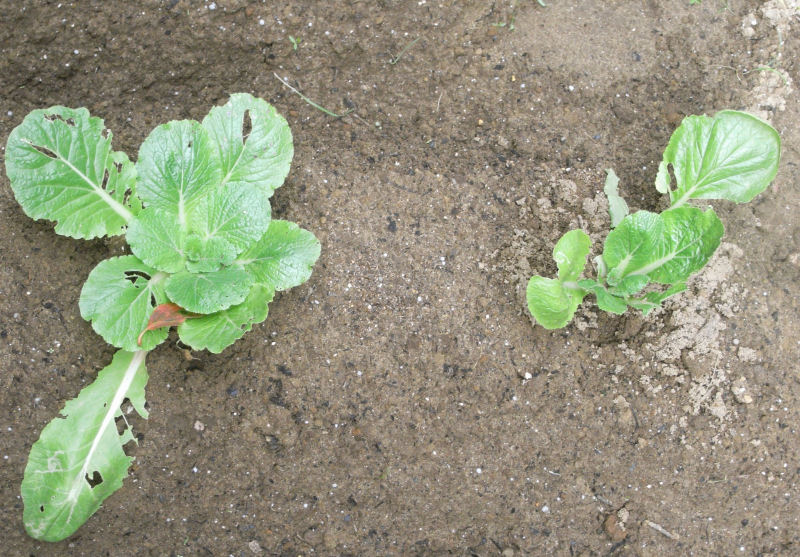 先週植えた、白菜の苗は大きな変化なし。ただ、一つの苗がヨトウムシの被害を受けていました。未だにいたのか・・・。しかも、耕したばかりなんで、どっからか移動してきたのか!?根本を少し掘ったら、あっさりと発見できたので、即処分しました。
