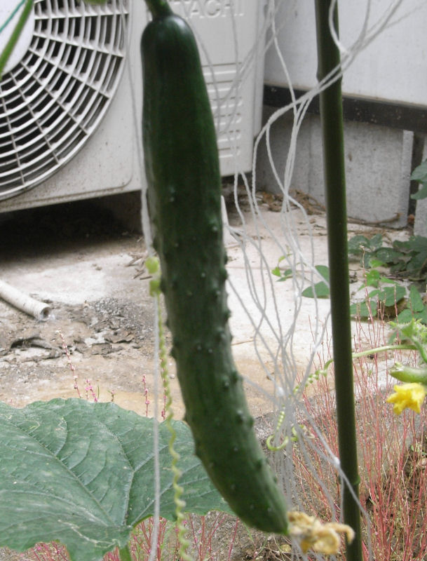 もう一株は、よく成長していて、実が大きくなり始めた一つが、そろそろ食べれるくらいの大きさになっていました。でも、これ1本だけ。この株は、なぜか雌花がすくなくて、実があまりついてなかったの。ようやく、他にも雌花がついていたんで、そのうち実がなるかなぁ。
