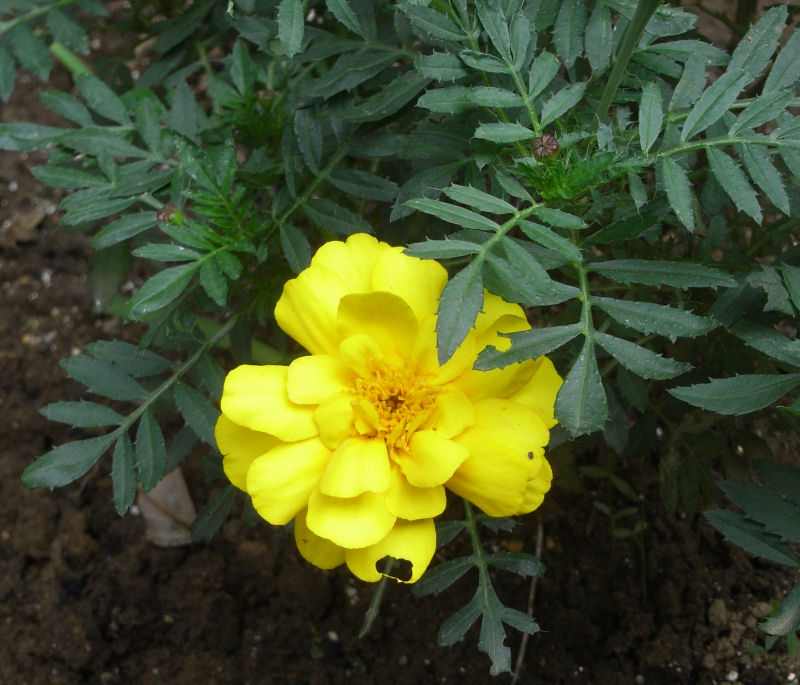 そのニンジンといっしょにコンパニオンプランツとして植えていた、マリーゴールドが遅ればせながら、最初の一輪が咲きました。キュウリといっしょに植えていたのは大分前に咲いたんだけれど・・・。