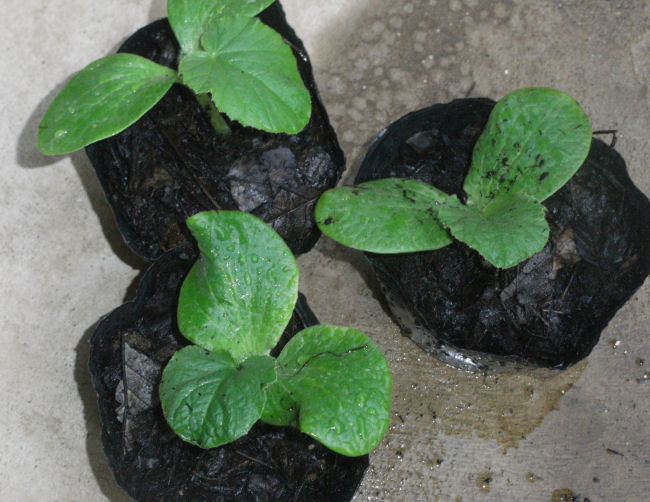 カボチャは、本葉が出て大きくなってきたので、1本立てにしました。最初に入れた腐葉土の量が少なすぎたっぽいんで、そこにつぎたしました。