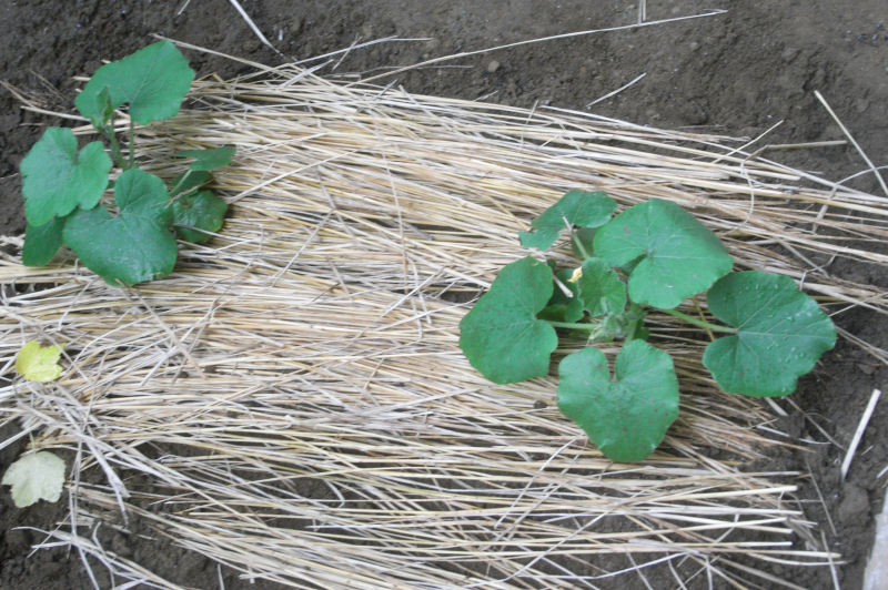 そして、カボチャです。葉がものすごい勢いで茂ってきています。こちらも、ワラマルチを敷きました。支柱を立てないで露地栽培にするつもりなんで。