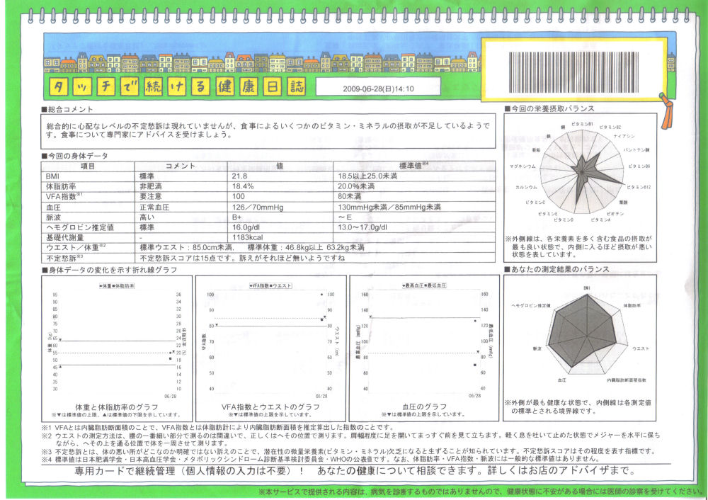 今日、イオン津田沼のドラッグコーナーで、「タッチで続ける健康日誌」なるものをやってみた。最初、単に血圧測りたかっただけだったんだけど、いろいろ検査できるみたいなんでやってみた。結構、目新しい機器もあったし。