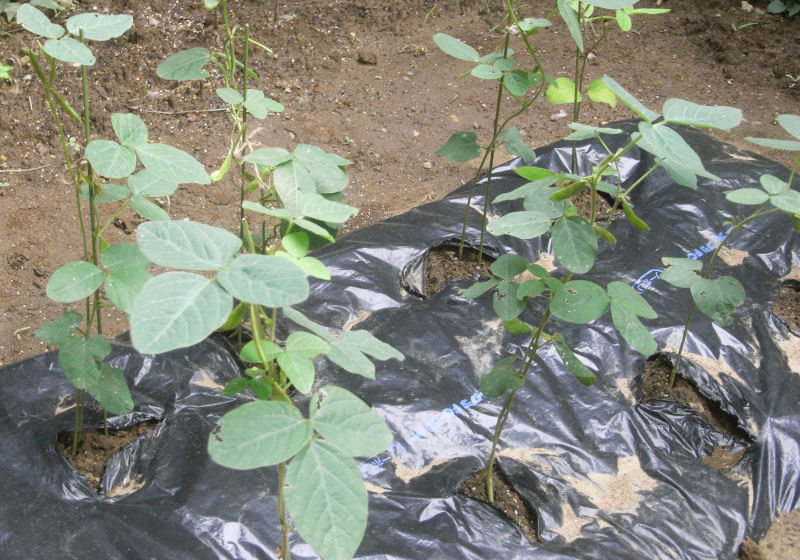 エダマメは、相変わらずひょろっとした感じです。ほとんどの株には、支柱をたてています。