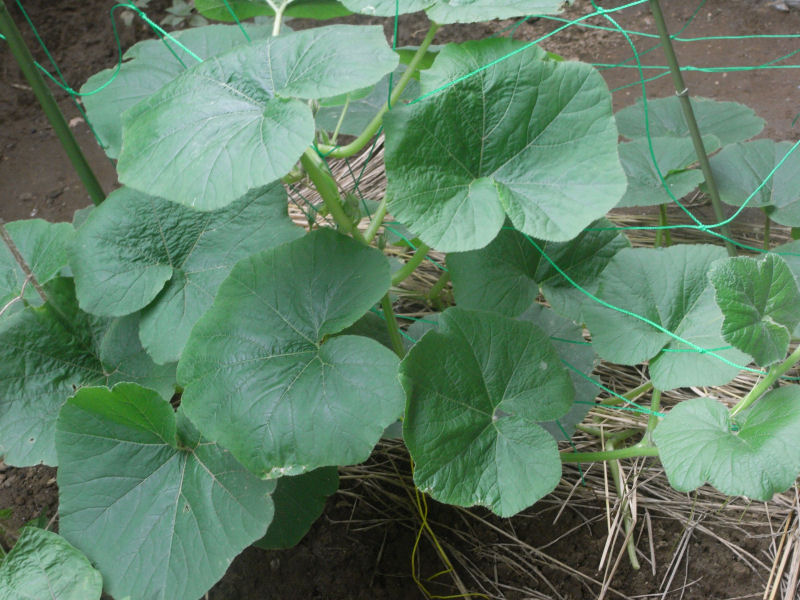 かぼちゃはすごい勢いでツルが伸びています。葉っぱも大きい。でも、なかなか雌花が咲かない。タイミングよく雄花がさかないし、梅雨時って事で、花粉も飛ばなそうだし。実がなるには、ちょっと厳しい季節です。