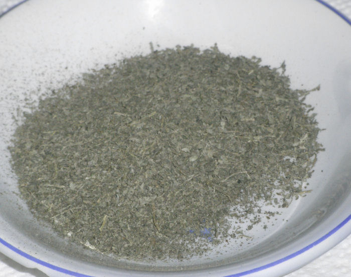 日曜に収穫して、洗って干しておいたバジルがいい感じに乾燥してきたので、すり鉢で磨り潰す事しました。