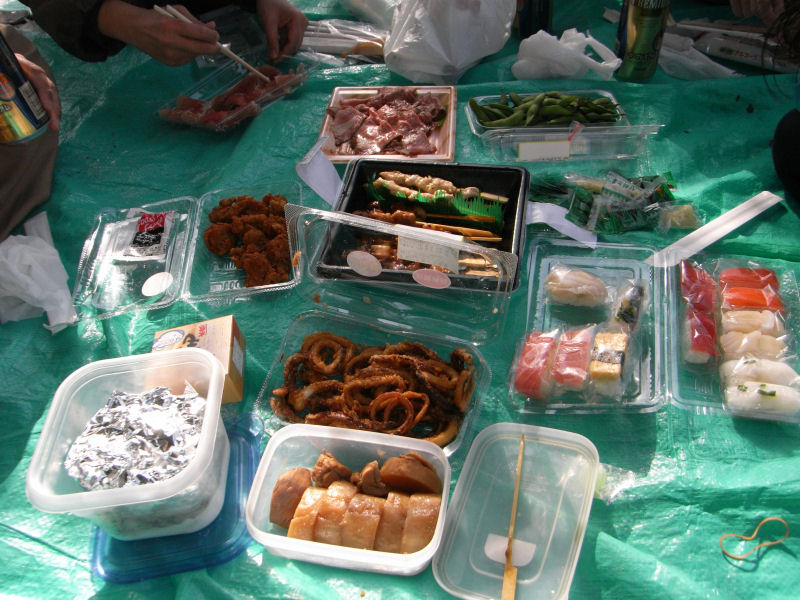 錦糸公園に場所を移して場所探し。工事中の箇所があって、少しだけ手狭な上に、絶好の花見日和って事で、たくさん人がいてなかなか大変でした。ようやく、旧体育館脇の桜でもない木の下に陣取ってお花見スタートです。