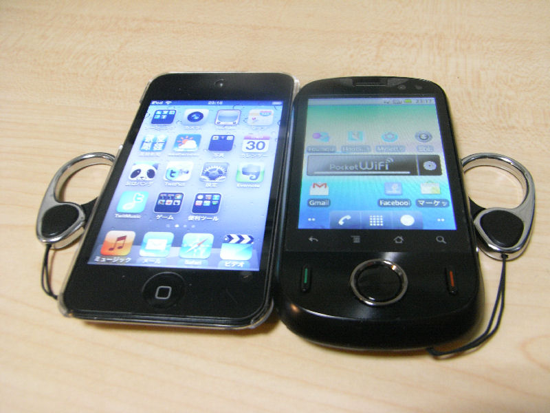 iPod touchと並べてみるとこんな感じです。こやってみると、そんなに大きさ変わらない感じもしますが、やはり小さいです。