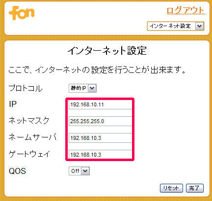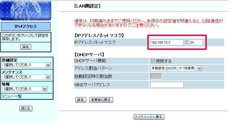 実際の設定箇所は、LANの設定でIPアドレスを変更しています。