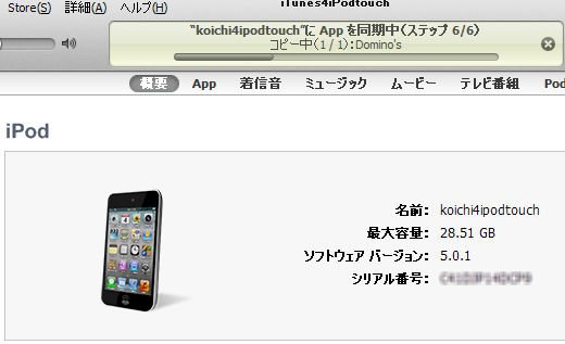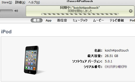無事に接続できたら、iTunesを起動してiPod touchが見えてるか確認してみます。
