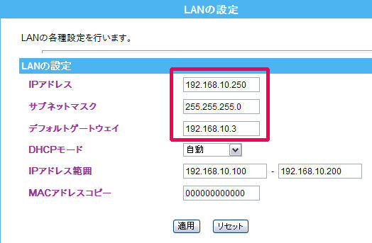 本体のIPアドレスはなんでもいいですが、DHCPで設定されるアドレスとかぶらないように大きめに設定してます。