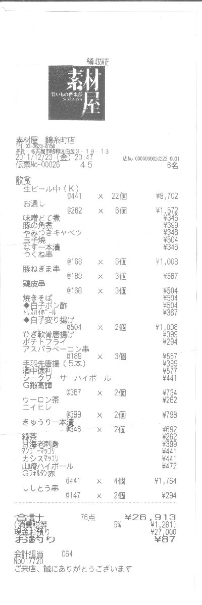 しかし、6人とはいえ、よく呑んだなぁw。レシート こんなでした。