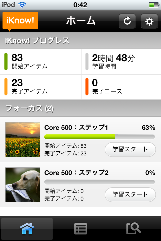 iKnowのiOSアプリのスクリーンショットはこんな感じ。学習時間とか、どこまで学習したかが判る。