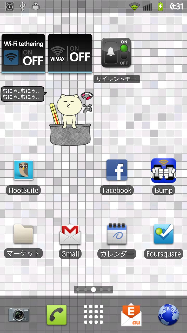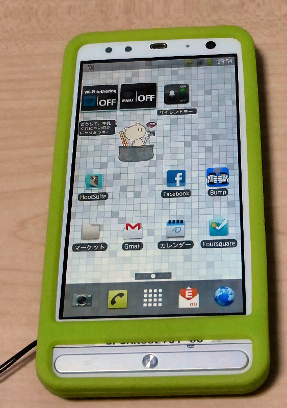 サクサク動いて、うれしい反面、バッテリーの持ちが恐ろしく悪いです。普通に使っても1日持ちません。WiMAXやテザリングをバリバリ使ってたら、さらに持たないでしょう。一応、年末にケータイアップデートがあって、改善されたらしいので、さっそく当ててみたのだが、期待ほど電池の持ちは改善されませんでした。
