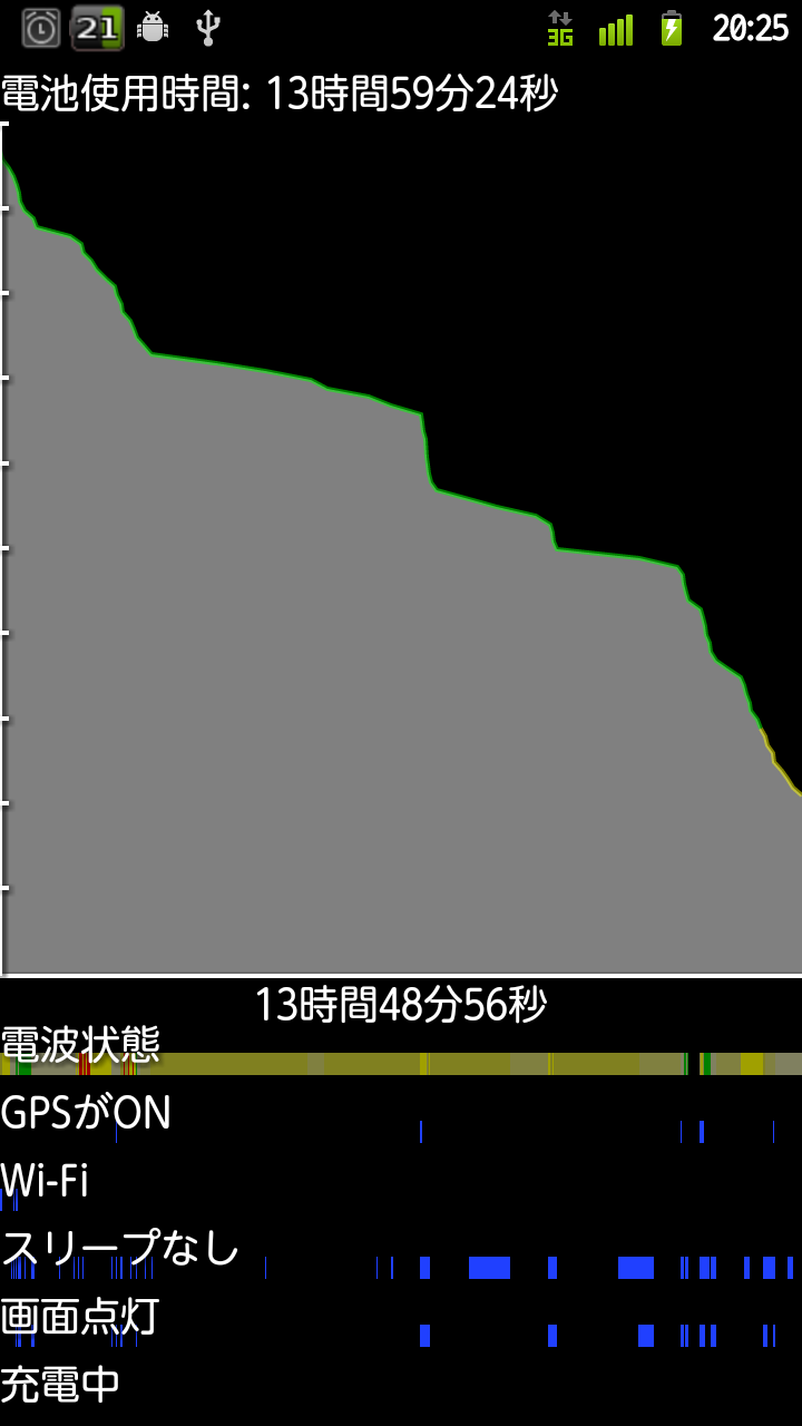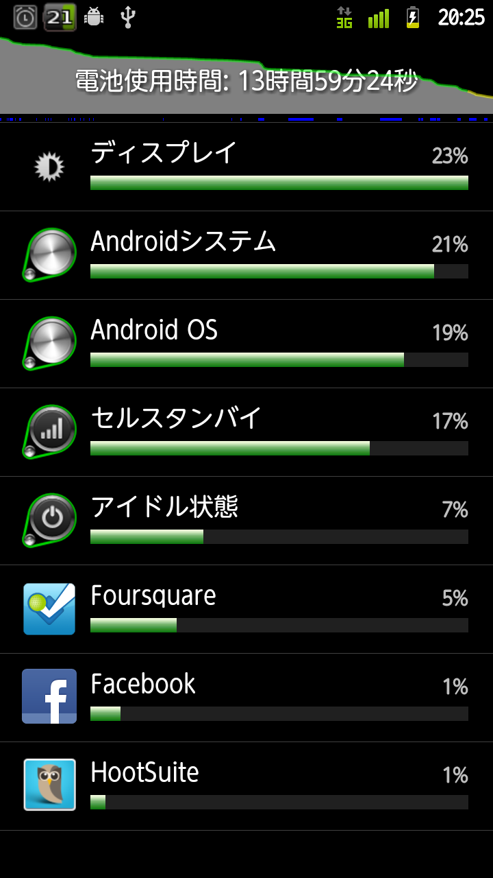 バッテリーが致命的にもちが悪いArrows Zだが、どこで一番消費しているかというとディスプレイのようです。照度を下げるなどの対策をした状態でも、かなりの電力消費率でした。