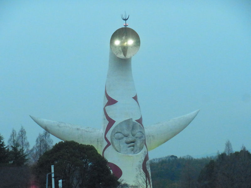 万博記念競技場から歩いて、大阪モノレール 万博記念公園駅まで向かいました。歩いている途中で、太陽の塔が見えるのですが、ちょうど日が落ちてきて目が光ってましたね。