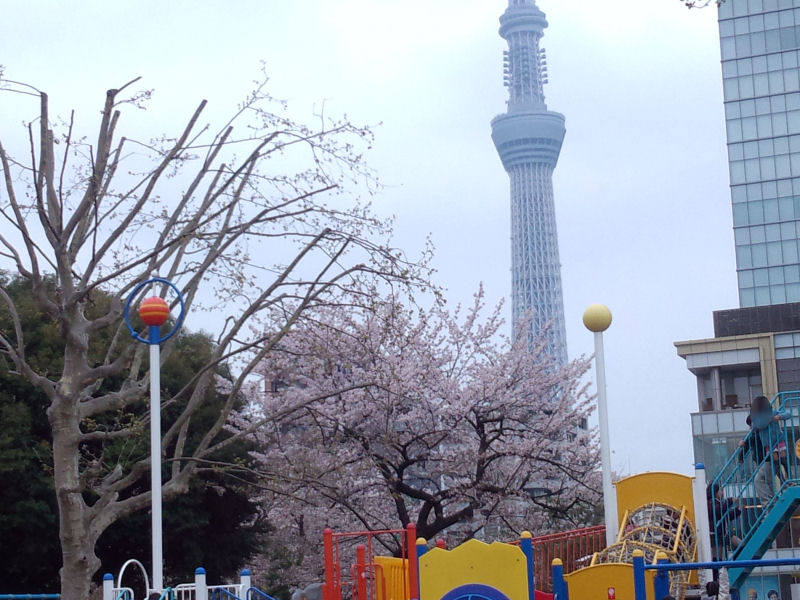 錦糸公園からはちょうど、桜とスカイツリーがいっしょに見れる場所があって、なんか良い感じです。子供が遊べる広場があってかなり人がきてました。