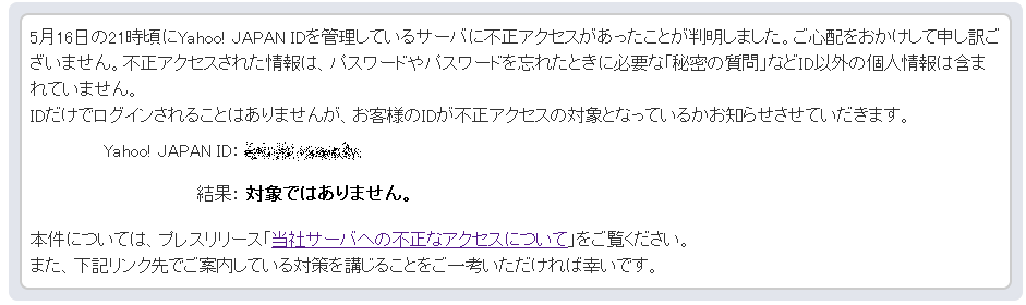 Yahoo! JAPAN - プレスリリース5月16日の21時頃に、Yahoo! JAPAN IDを管理しているサーバに外部からの不正アクセスがあったことが判明しました。4月2日に発生した不正アクセスを受けて監視体制を強化していたところ、不審な ...
