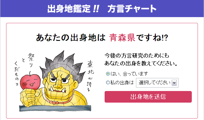 自分もさっそく鑑定してみました。最初やったときは、岩手県と鑑定されてしまいましたが、2度目ではズバリ青森県と鑑定されて当たりました。
