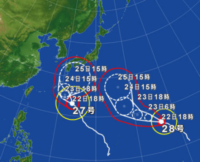 台風27号が日本に接近してきている中で、台風28号が発生。2つの台風がお互いに干渉し合い「藤原の効果」という現象がおこりそうだという事で台風の進路に要注意です。