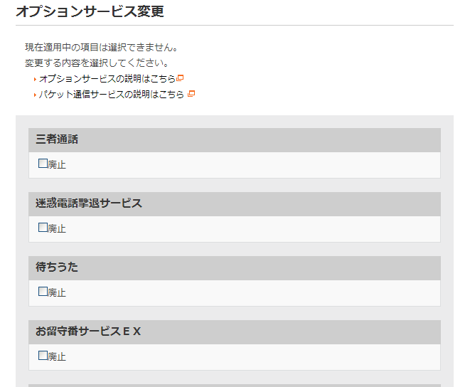 「廃止はこちら」のリンクを辿って、オプションサービスの変更出来ます。