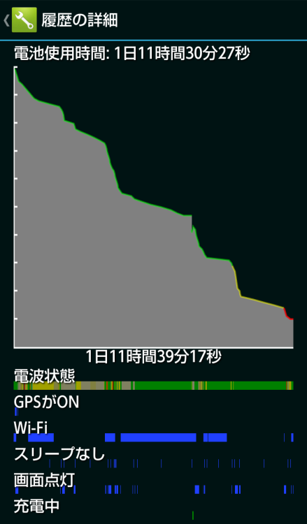 こうやってみると、Wi-Fiを使っているとゆるやかに電池が消耗してしまうようです。自宅にいるときはWi-Fiで使ってますが、普段はオフにしてた方がもう少し持ちがよくなるかもしれません。