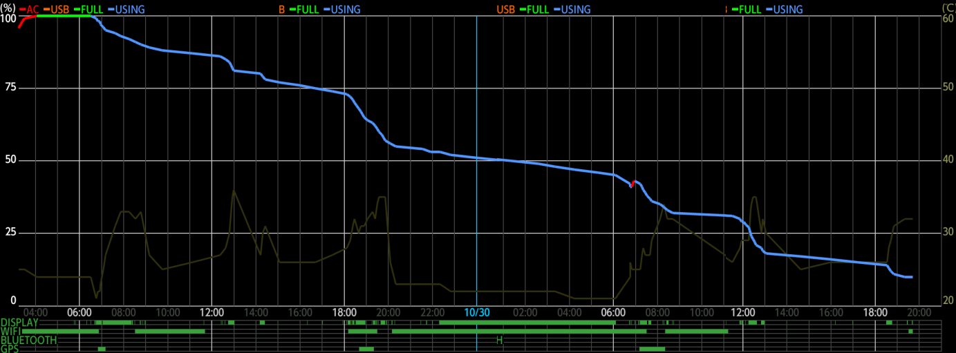 あらためて、別の日にバッテリーの持ち具合を計測してみた結果です。