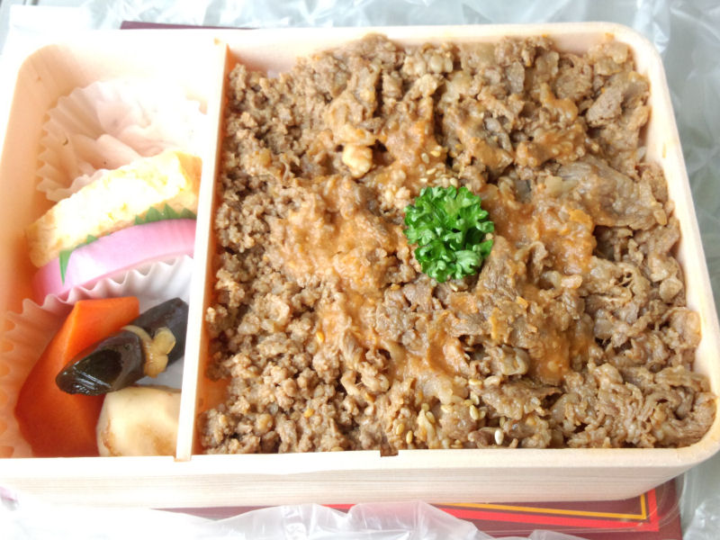 そして、お弁当の中身です。みそ味の牛肉がいっぱいに乗せられています。