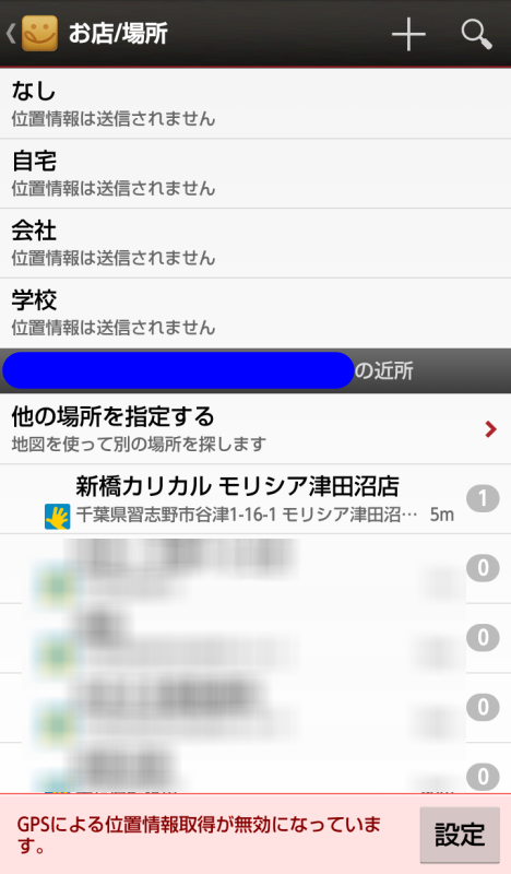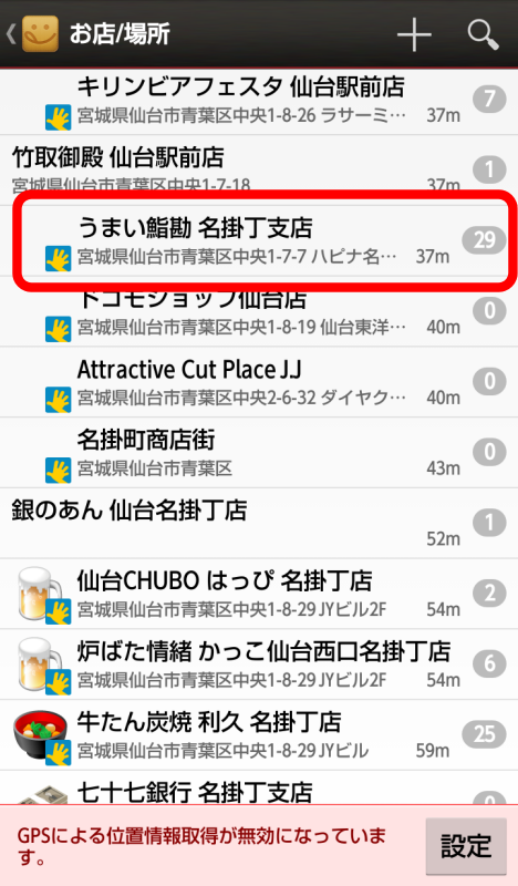 初期状態で表示されるのは、現在地周辺のお店情報です。今回は、遠くはなれたお店を登録してみます。