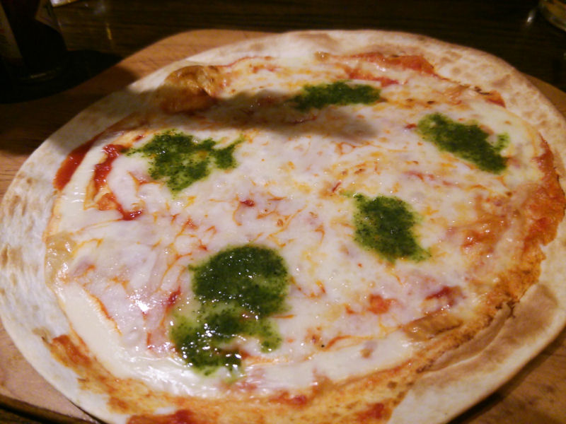 これが意外に美味しかったですね。生地自体は薄い感じで、チーズになぜかバジルソースがかかった感じでしかないですが、熱々のピザはこの時間美味しいです。