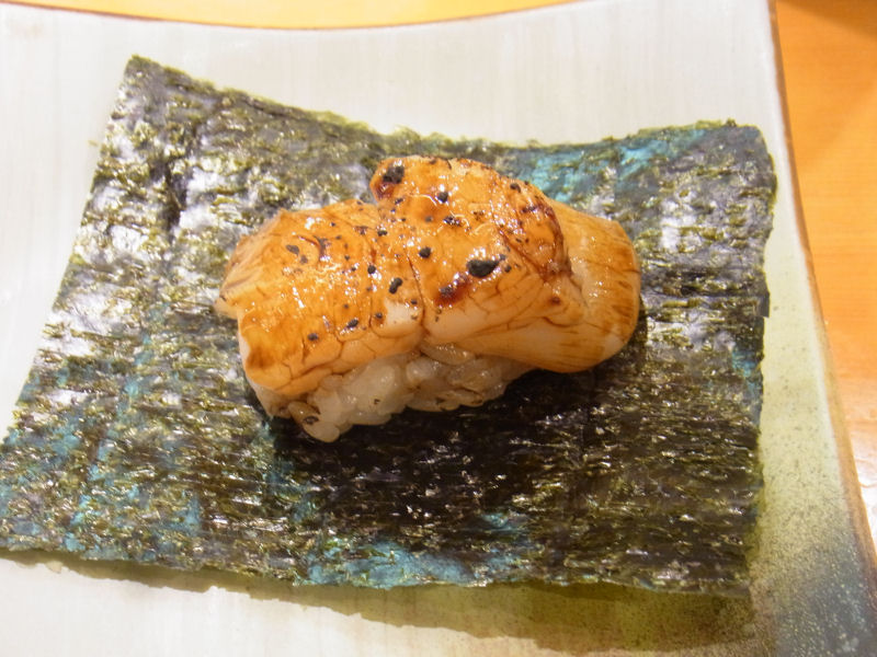 炙りホタテ磯辺握りです。炙ったホタテにタレをつけて、これを海苔でまいて食べます。元々、ホタテは好きですが、こういう食べ方は初めてですね。