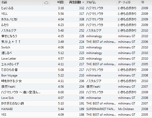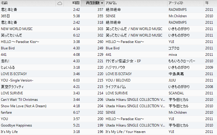 という事で、自分もiTunesで聴いた曲の再生回数の上位をアップしたいと思います。