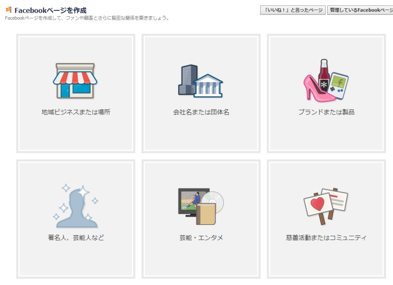 Facebookより、右上の歯車のアイコンから、「ページを作成」を選ぶと以下の画面になります。