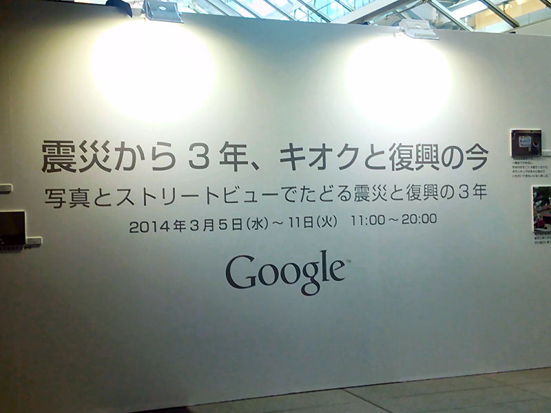 土曜日(3/8)ですが、Googleの開催している「Google 震災から 3 年、キオクと復興の今 ~ 写真とストリートビューでたどる震災と復興の 3 年間。~」という展示とトークイベントに行ってきました。