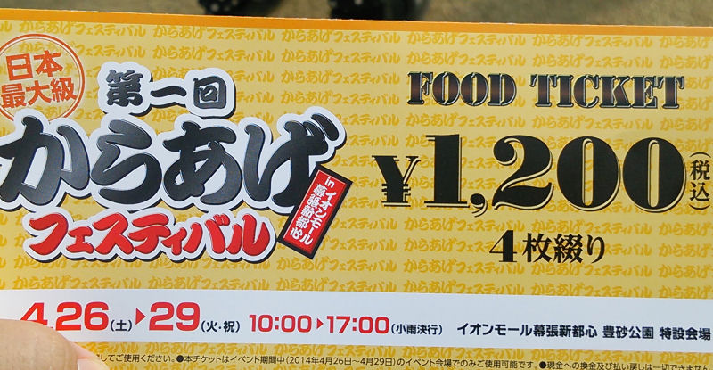 この、からあげフェスティバルは4/26からやっていたようで、明日4/29まで開催しているようです。なお、小雨決行なので、多少雨が降っても開催されるようです。