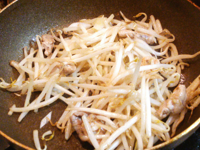 まずは具を炒めます。豚肉、もやし、ネギを順に入れながら炒めます。