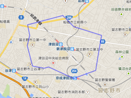 こうやってみると、津田沼駅の周りのかなり区域と同じだとわかりますね。