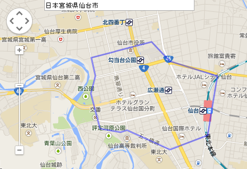 例えば、仙台駅の西側を大通りに沿って囲んでみます。