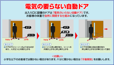 2011年のニュースで「電気を使わない 自動ドア」が話題になっていました。福島県郡山市の会社が開発したもので、渋谷ヒカリエでも使われています。