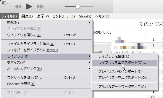 起動したら、「ファイル」メニューから「ライブラリ」→「ライブラリをエクスポート」を選んでXML形式でファイルに書き出します。