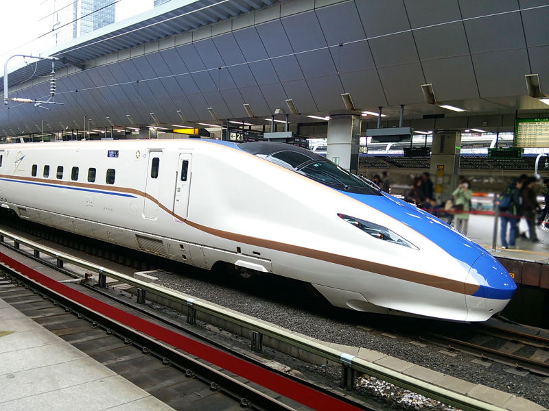 新幹線ホームで、乗る予定の新幹線を待っていたら、隣のホームに開通したばかりの北陸新幹線の車両がありました。