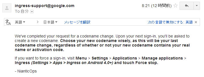 今回は3月9日を出してから4月10日に返答がきました。無事に、コードネームの変更が受け付けられたとメールが届きました。