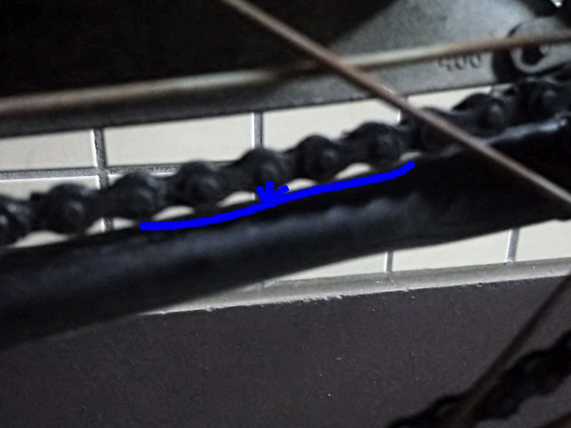 見てみると、どうもチェーンがゆるい感じがしました。そのせいで、チェーンが、フレームに当たってしまい外れやすくなっていたようです。