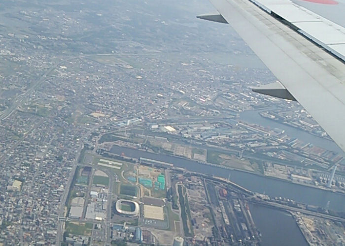 西日本から羽田へ向かう場合は、房総半島から回っていく事になります。丁度、羽田に近づいて高度も下がってきたあたりで、フクダ電子アリーナがよく見えます。ここまで来ると、帰ってきたなという気がしますね。