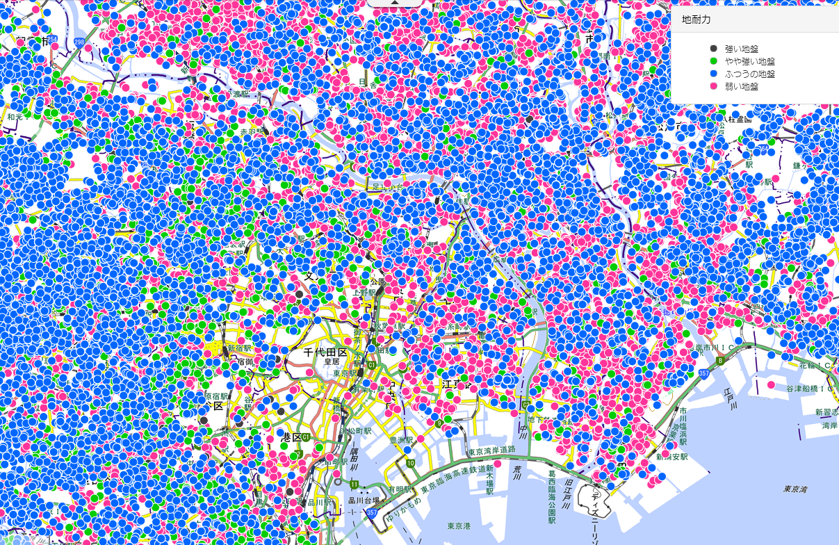 これは、ジャパンシールドが過去に行った物件の地盤を調査したデータを地図上に落とし込んだものになります。