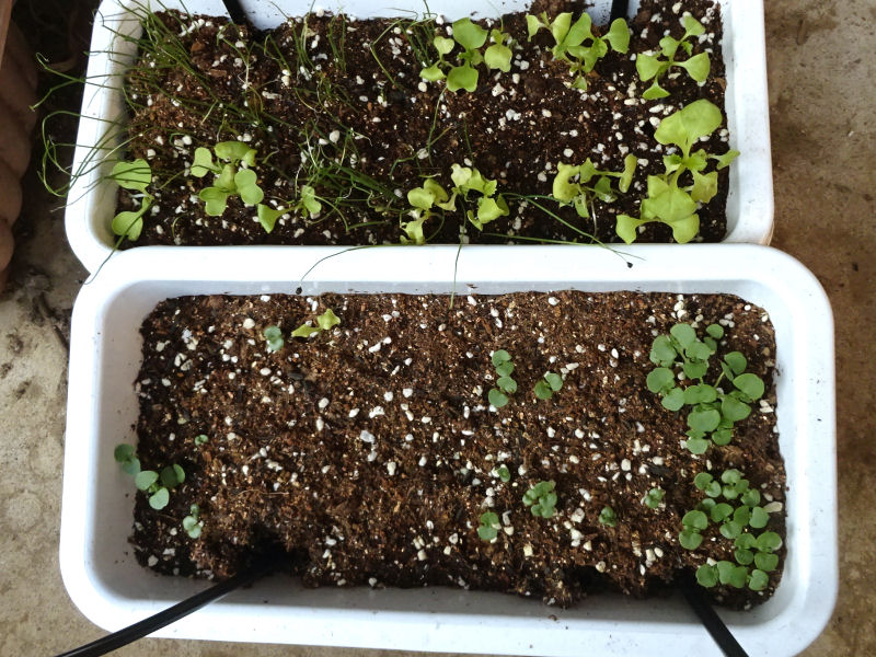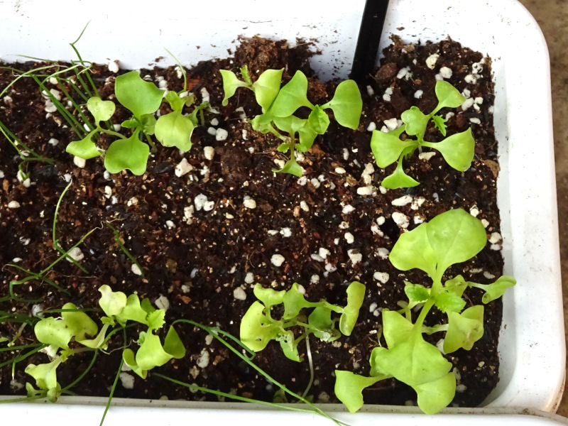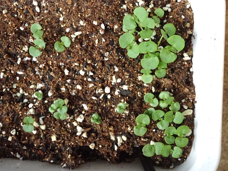 青シソの方は、まだ芽が出てきたばかりという感じです。こちらも、固まっているところは間引いておきました。